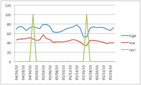 Rain is shown as a binary condition: the forecast data either said rain or no rain, so 100 is a rain day, & 0 is a non- rain day.
